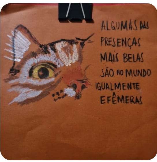 Pertencer a alguém é uma escolha agridoce – uma que implica por lógica deixar de pertencer a si. Jamais ousaria dizer o que sente um gato, mas, enquanto vivi com aquele, senti uma doação amorosa que jamais se perdia de vista: proximidade e presença. A entrega possível: estávamos perto, prestávamos atenção (em tudo ao meu amor serei atento). Compartilhávamos a cama e a vida com um entendimento tácito: o de que aquilo era um privilégio.