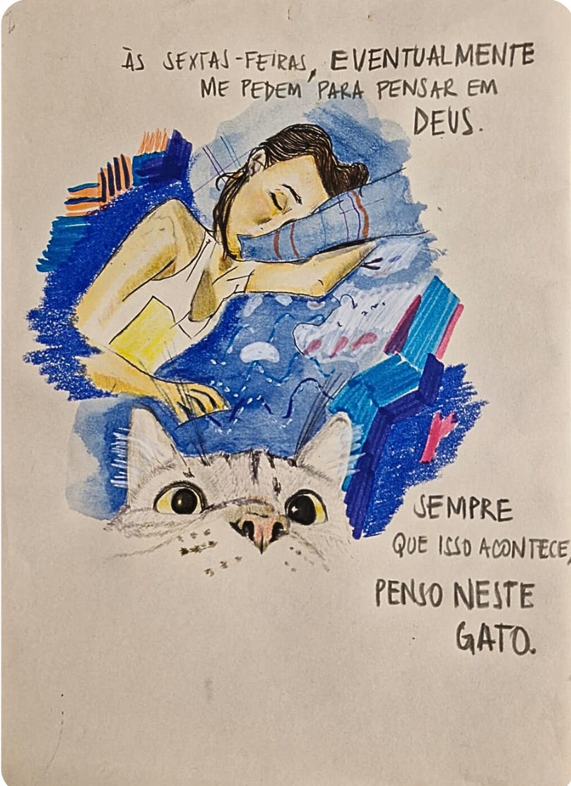 Quando me pedem para voltar o pensamento para deus, o meu sempre se volta para o gato. Em 2016, um garoto chamado Theo tirou uma fotografia enquanto eu sonhava e depois foi embora sem que eu acordasse. No dia seguinte, recebi esse presente (com a alegria de quem reconhece imediatamente algo que lhe será especial dali em diante). A morte me separou do gato. A separação me separou da foto impressa.
